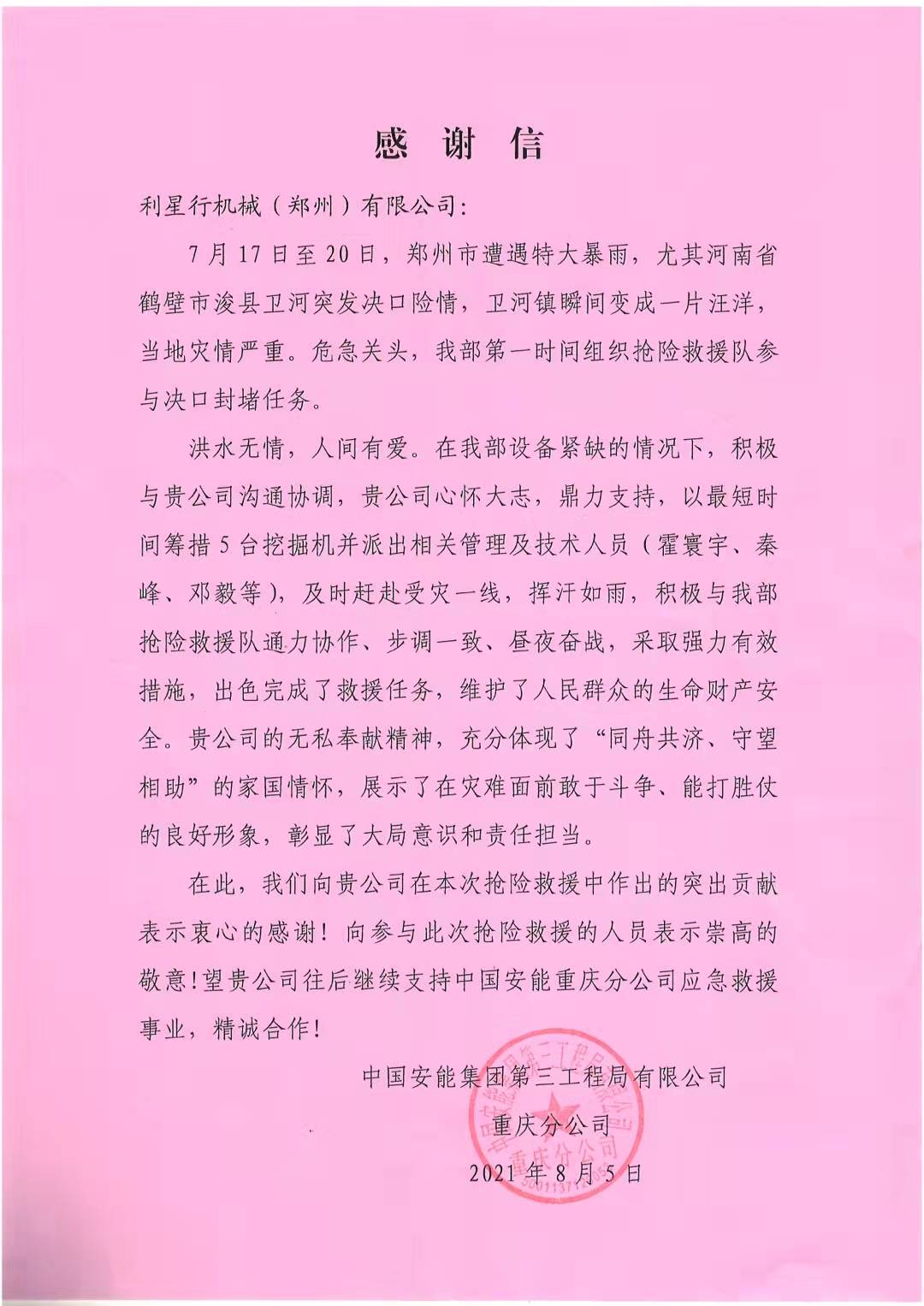 近日,我司河南省省級(jí)服務(wù)中心,利星行機(jī)械(鄭州)有限公司收到來自中國安能集團(tuán)的關(guān)于利星行機(jī)械支援卡特設(shè)備并參與7.20水淹搶險(xiǎn)的感謝信和錦旗,本次的5臺(tái)挖機(jī)設(shè)備由事件公司租賃部提供,這是我們集體的榮譽(yù),是公司團(tuán)隊(duì)精誠合作的成果。